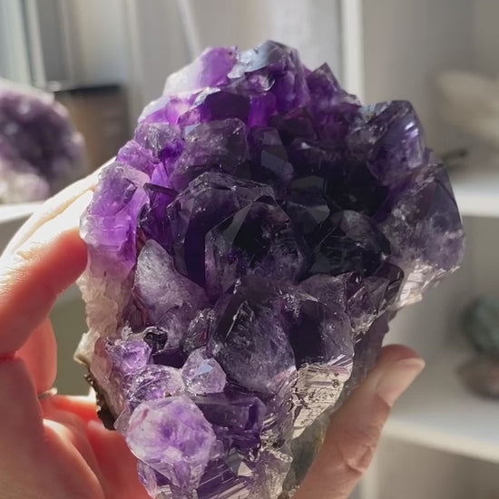 Juicy, saturated purple amethyst cluster with chunky points. Amethyst is associated with our crown chakra and is a powerful stone to use if you want to tap into your intuition. It can also help to ward off limiting self beliefs and balance out emotions.
