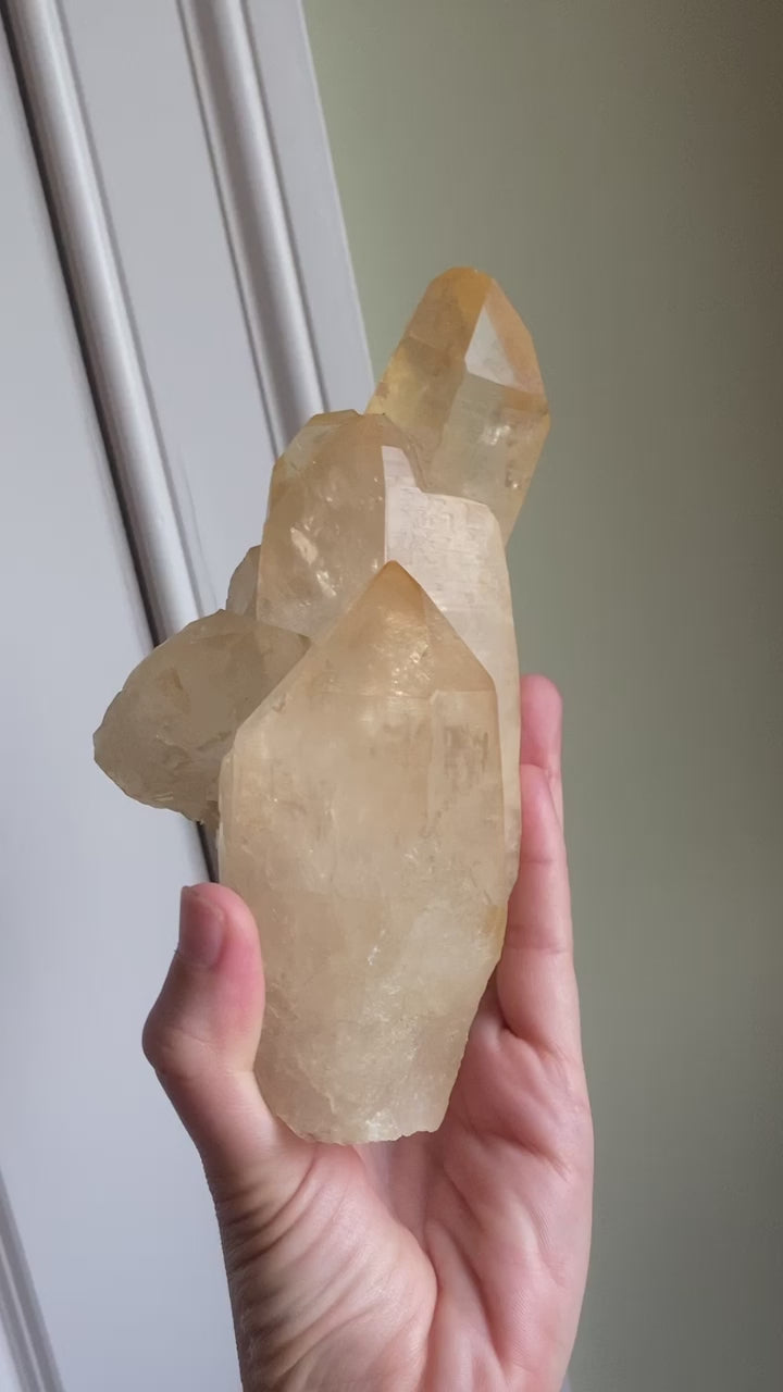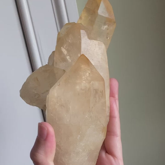 Super rare tangerine quartz cluster with large, chunky lemurian points with striations. The vivid orange color in tangerine quartz comes from a thin coating of hematite. Tangerine quartz provides us with the strength to make it through life's challenges allowing us to step into our power fully and unapologetically.