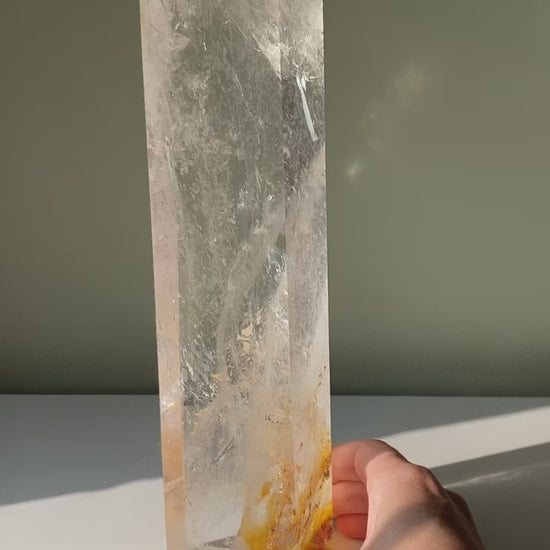 This is a stunning large high quality polished clear quartz tower with rainbows and iron (golden healer) and hematite inclusions. Clear quartz is known as the master healer. It is a great energy amplifier and powerful manifestation tool. It will help bring emotional clarity into your life.