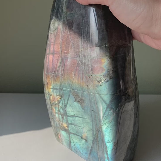 Unique labradorite freeform with a cool split face flash boasting colors of pink, purple, yellow, orange and blue. Statement piece. Labradorite is a stone of spiritual protection and can help to enhance spiritual gifts and awareness.